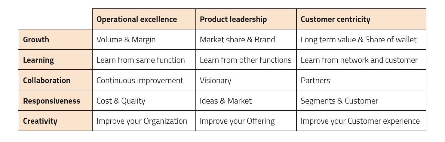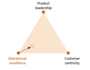 You need to use all of the strategies to some extent, but you can never be number one in all three at the same time; this is simply too expensive. Instead, you need to choose the one which you do better than your competitors and then remember to do a bit of the others. In most market segments today, people expect more and more from the companies. It’s no longer enough just to have a great product – it also needs to be reasonably priced (operational excellence) and in many cases customized to fit specific customer needs (customer centricity).